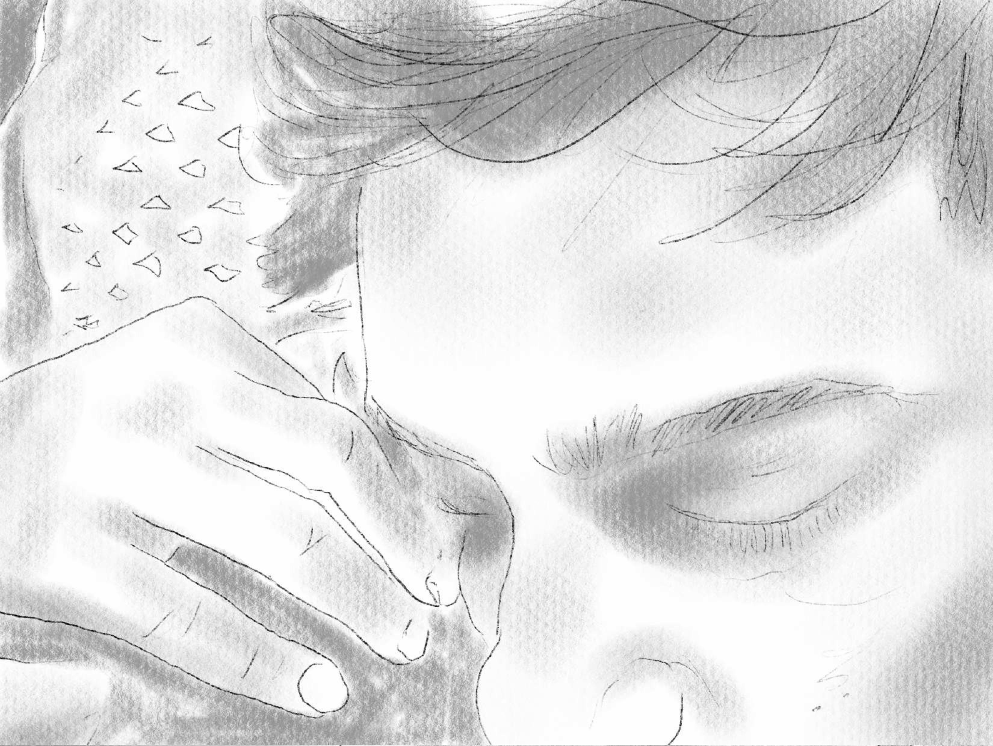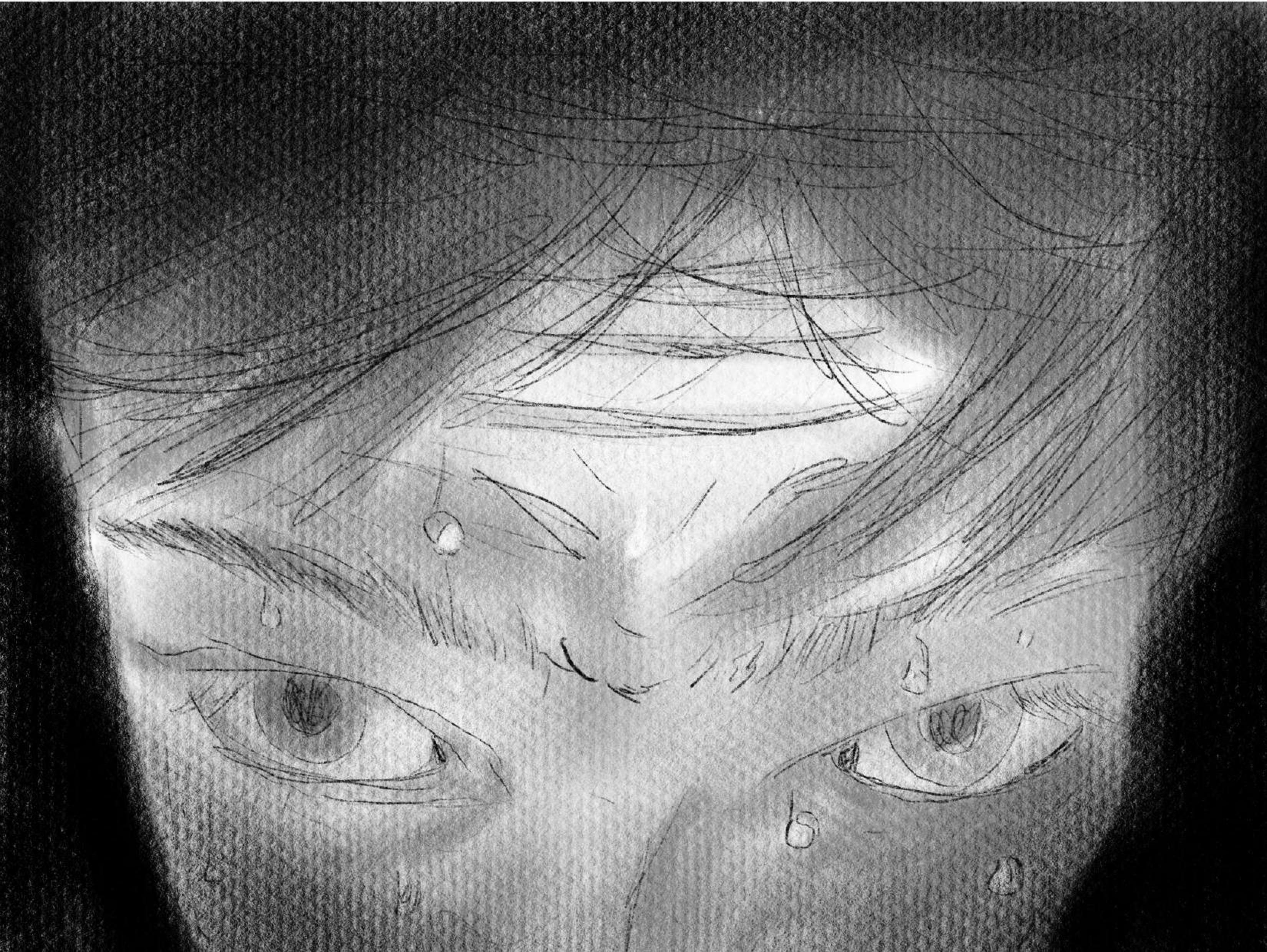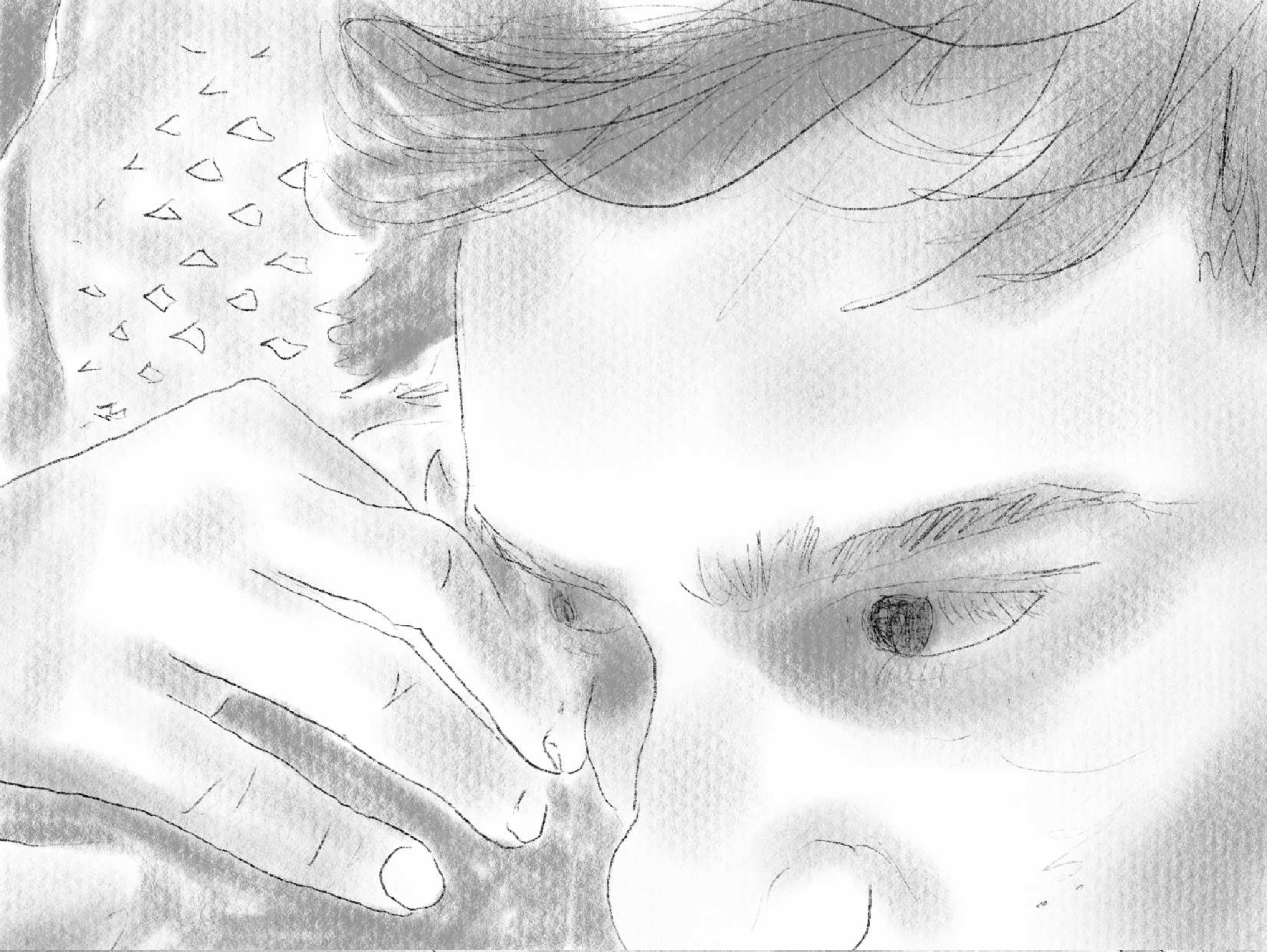 5 (17) | He looks at the camera, sweat covering his forehead. | Use water droplets to simulate sweat. Camera up looking down. | Extreme Closeup |