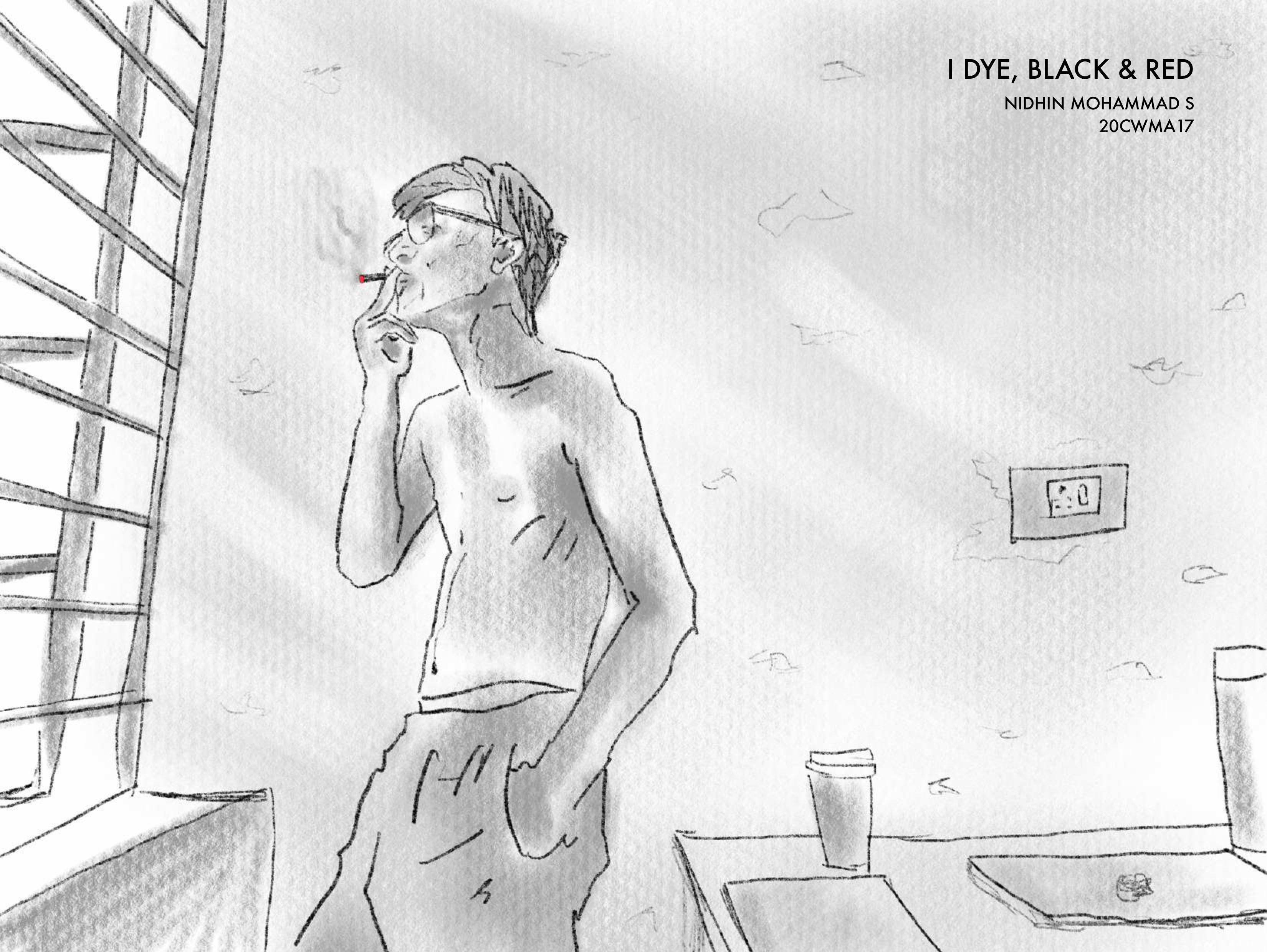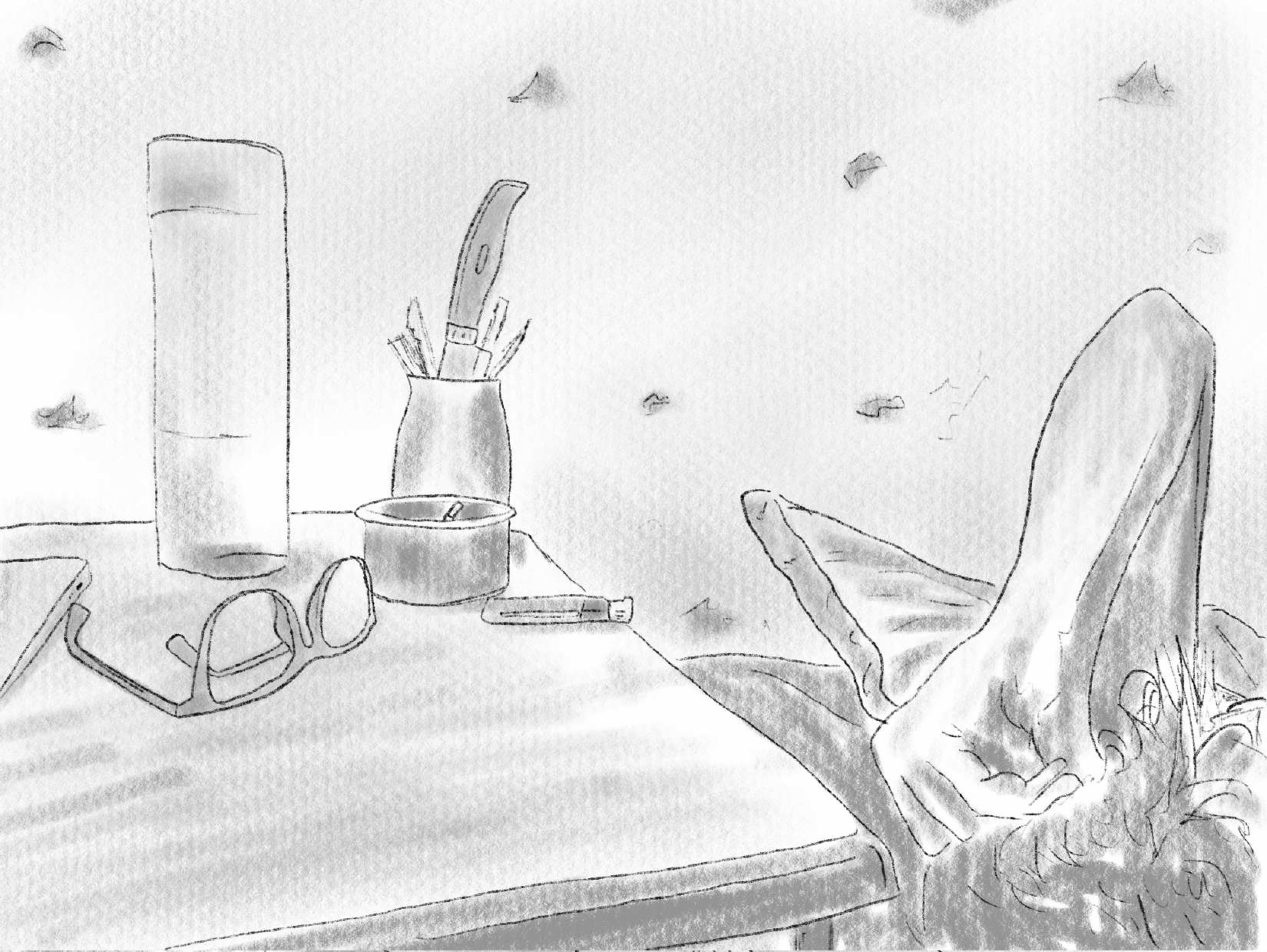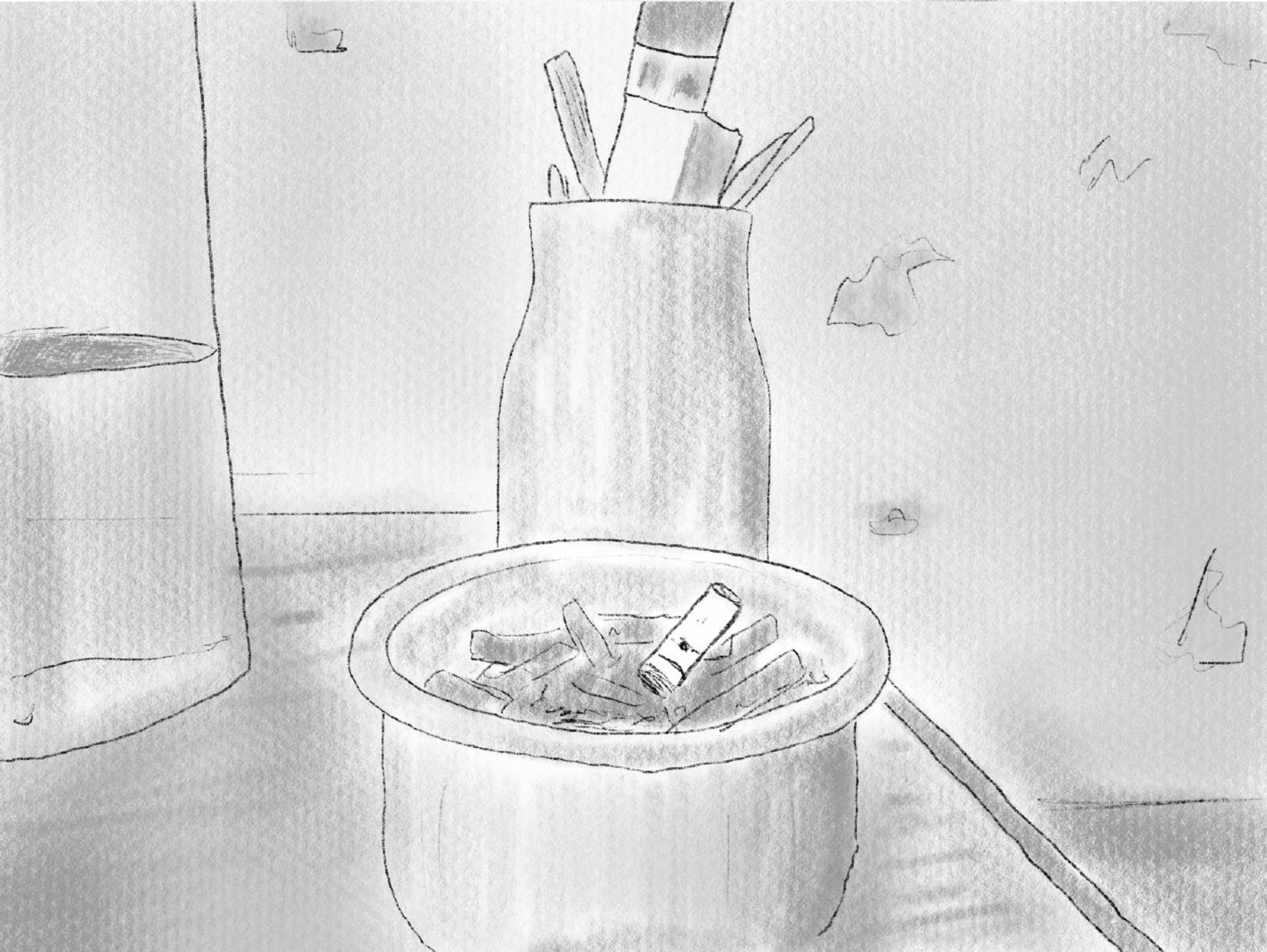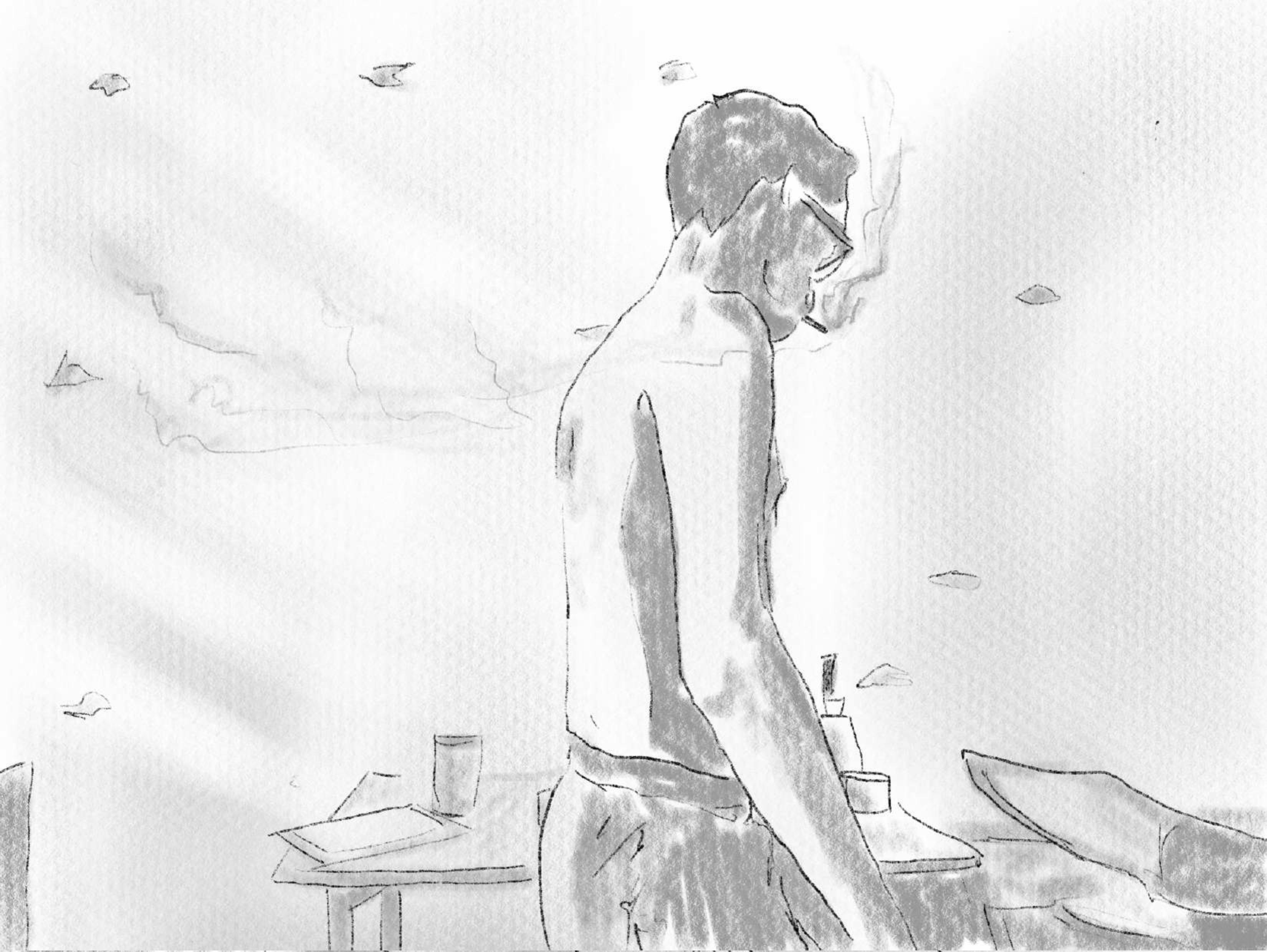 3 (3) | Puts out the cigarette. | Camera locks in on this frame until the next one. | Wide/Medium |