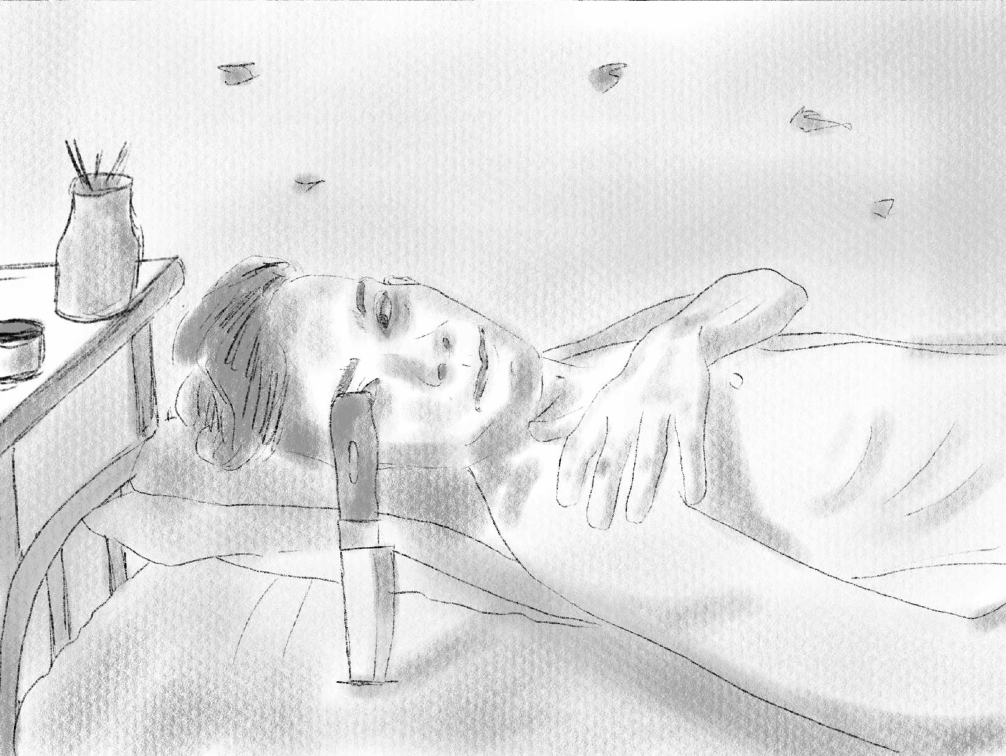 4 (16) | The knife lies next to the pillow where it fell, impaling the mattress. | His hand next to the knife, shaking with fear. Shallow depth of field, with the knife in focus and ‘A’ looking at it in the background. | Medium |