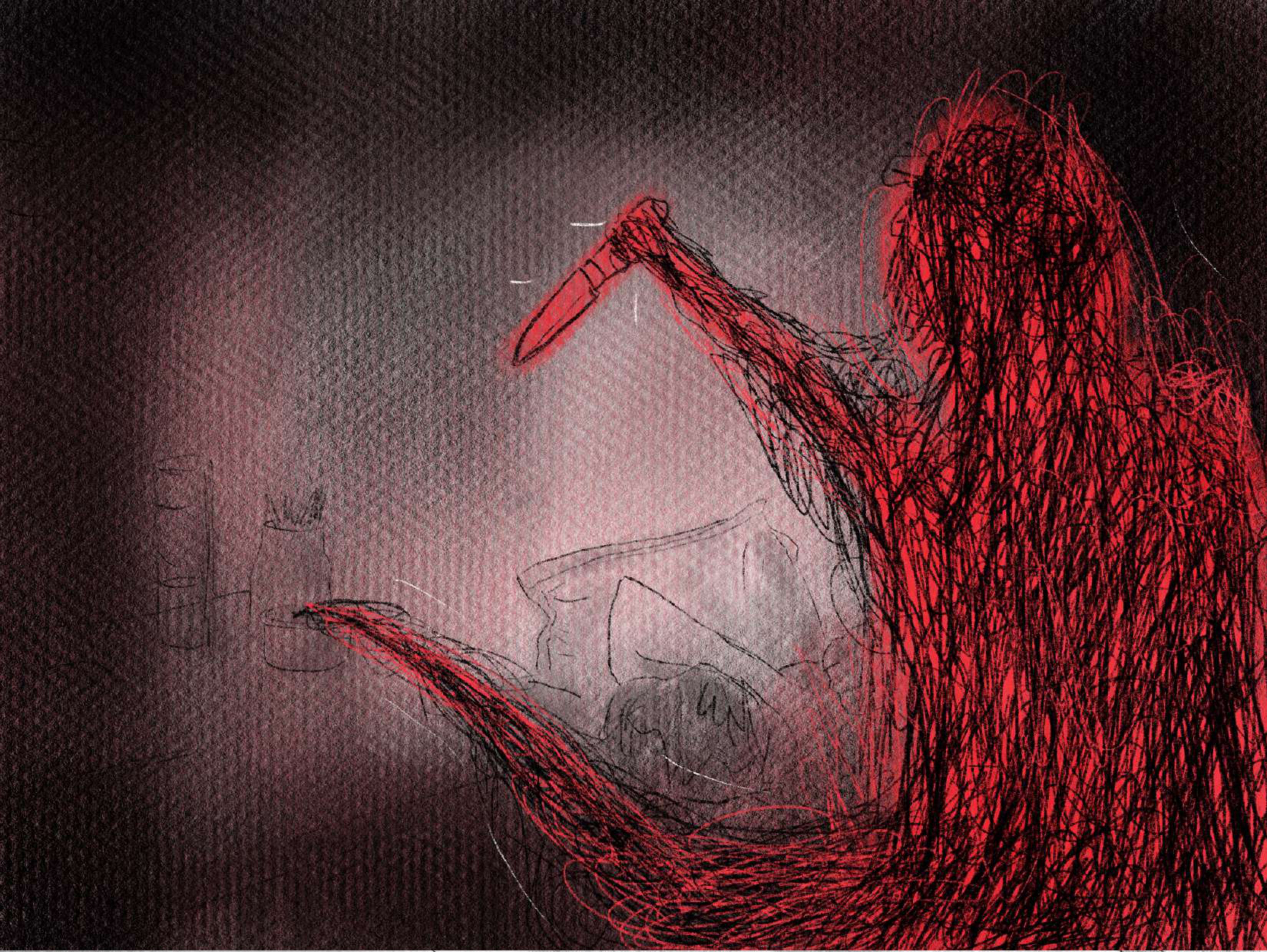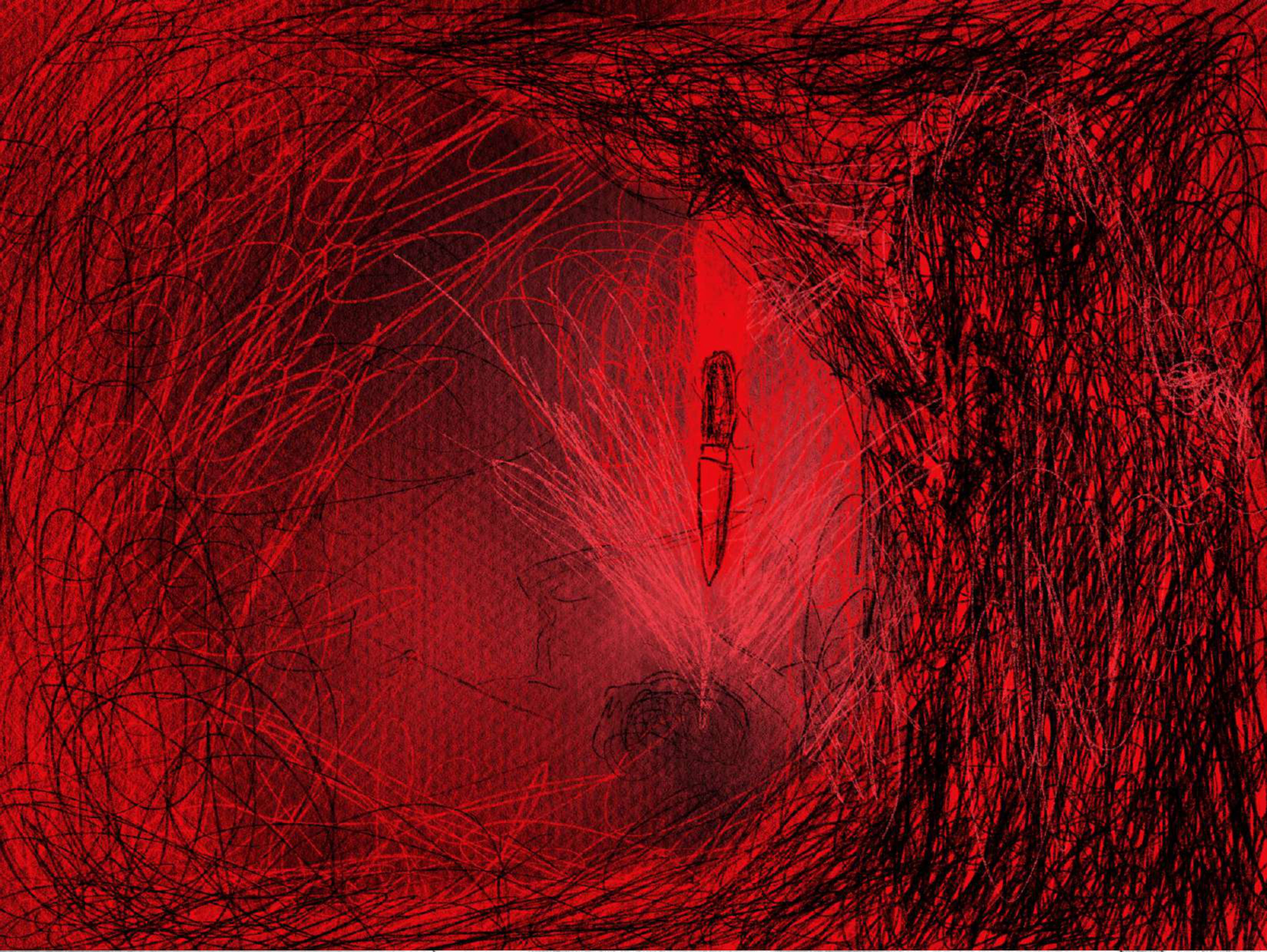 7 (12) | The figure let go of the knife, it drops down with the point facing 'A'. | Strings. Red filter at it's most saturated. | Medium |