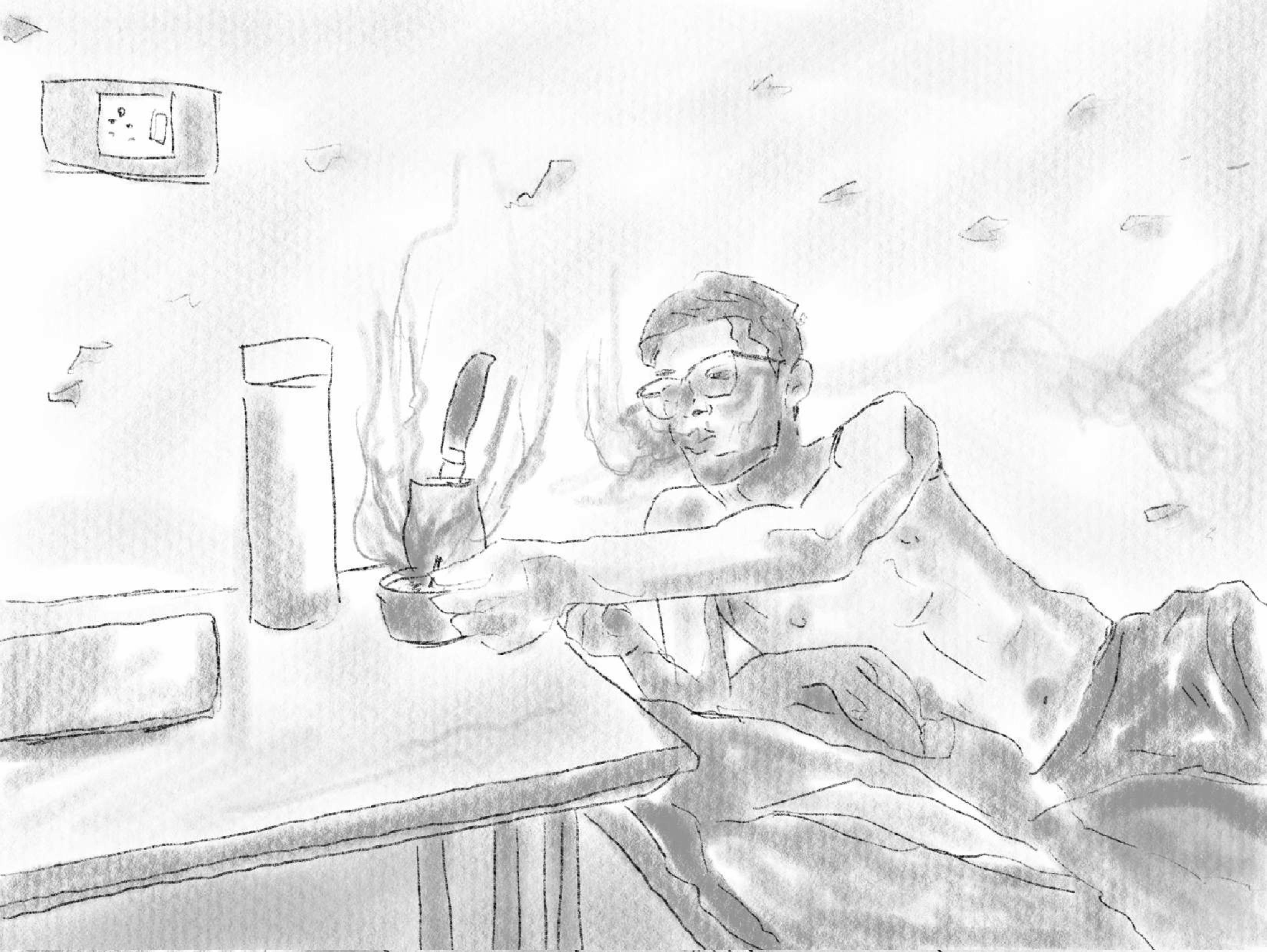 4 (4) | Focusing on the ash tray, he lies down on the bed. | Wide/Medium | |
